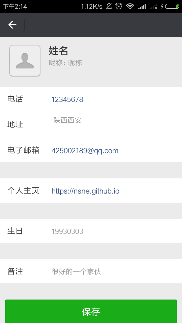 生成二维码以及用微信扫描的结果如下,保存按钮可以将名片信息保存到通讯录: